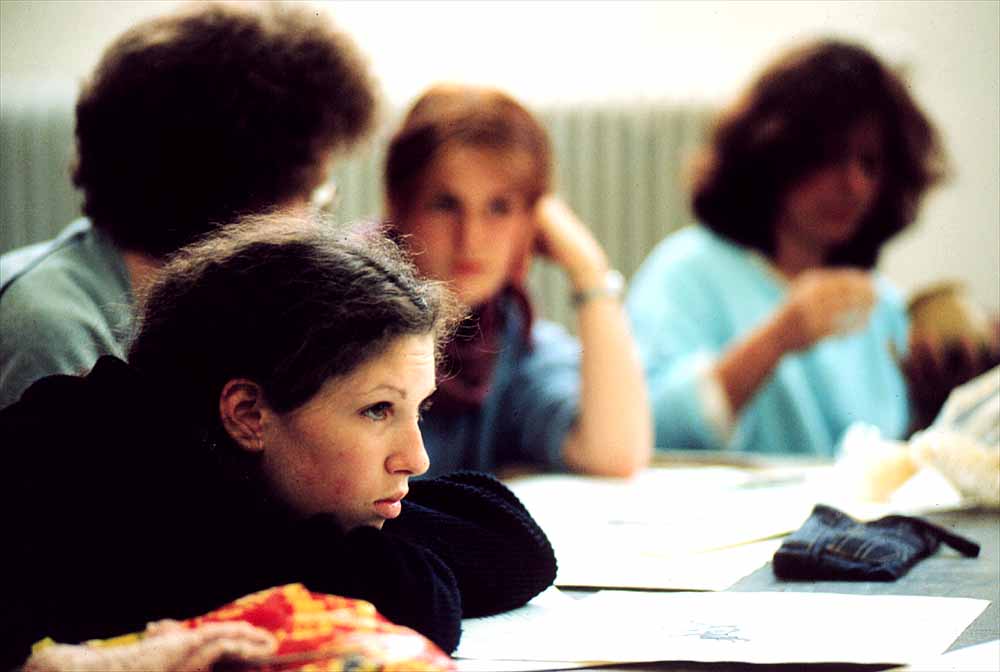 Heike Ulmer macht es sich im Kunst-GK gemütlich. Im Hintergrund unterhalten sich Peter Renninger und Eva Maletz, daneben Susanne Meszaros.