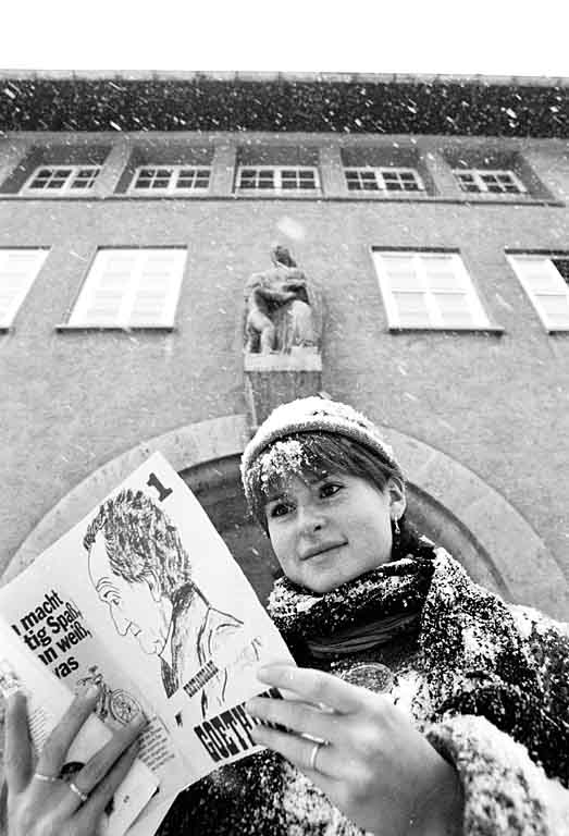 Eva Maletz mit "Goethicus". Die Aufnahme entstand 1982 für die Jubiläumszeitung des Goethe-Gymnasiums